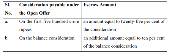 (b). On the balance consideration (above ₹500 crore): The acquirer must deposit an additional 10% of the remaining amount.